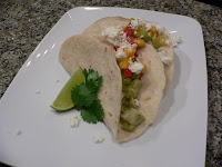 Plate with fresh corn or flour tortillas, mango-corn relish, queso fresco and lime wedges. Enjoy!